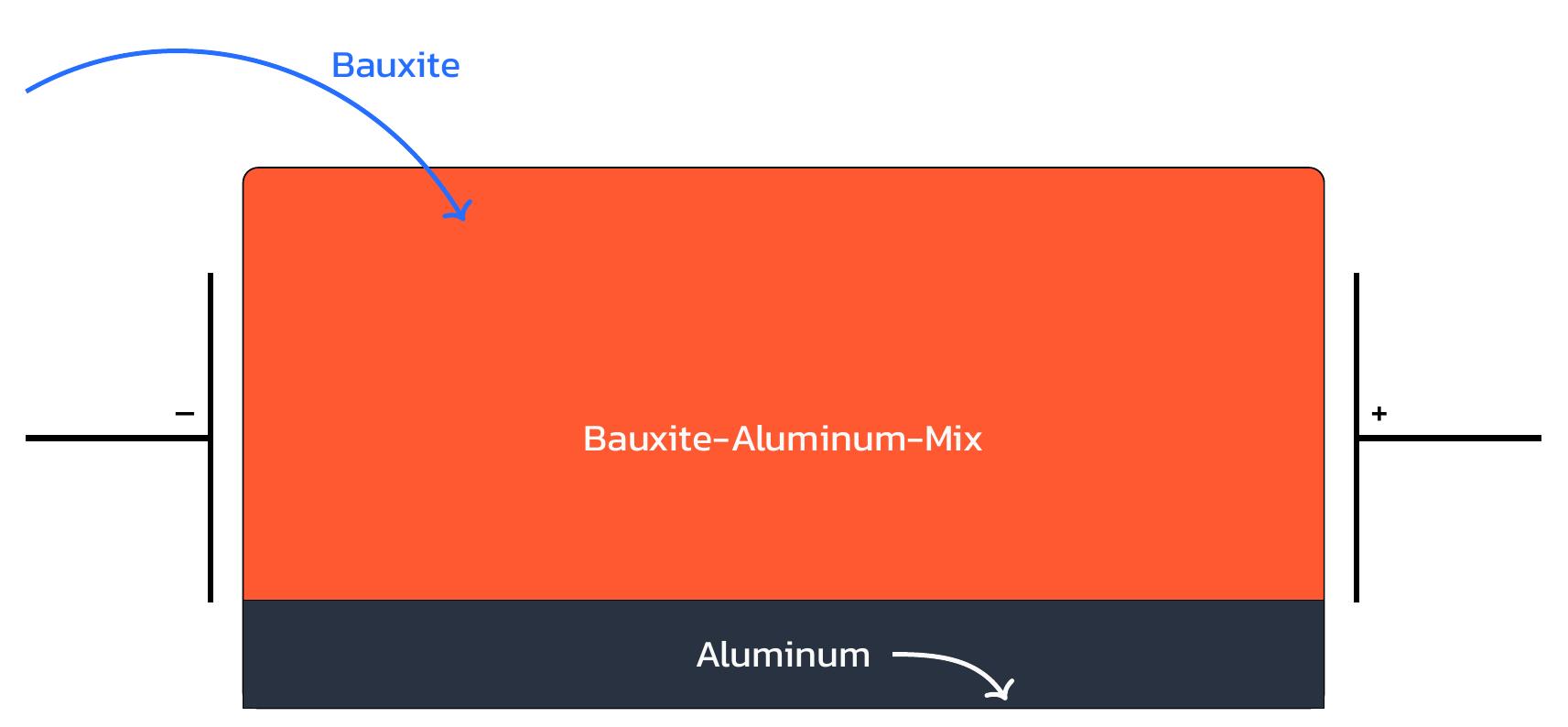 To produce aluminum requires to remove the aluminum molecules from the ore, i.e., to flush the molecules from the sofa – clearly, this requires a lot of energy. Nearly 15 MWh of electrical energy is needed for each ton of aluminum. That requires five large wind turbines to supply electricity for one hour! In electrolysis, electrical energy is used to separate the aluminum molecules from the bauxite in a container with a hot bauxite-aluminum mass. The pure aluminum is heavier than the bauxite-aluminum mass and therefore sinks to the bottom, where it can be easily collected.